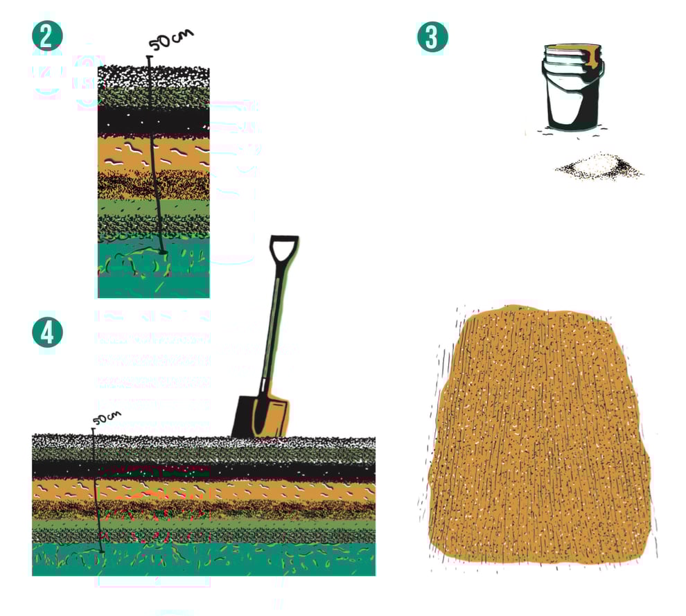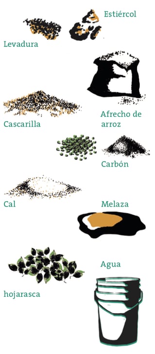 - Primero se coloca una base de rastrojo previamente triturado y agrega capas de tierra, cascarilla de arroz, estiércol, carbón, afrecho de arroz y cal. Después se mezclan los materiales hasta homogeneizar. La altura de la abonera no debe de sobrepasar los 50 cm.