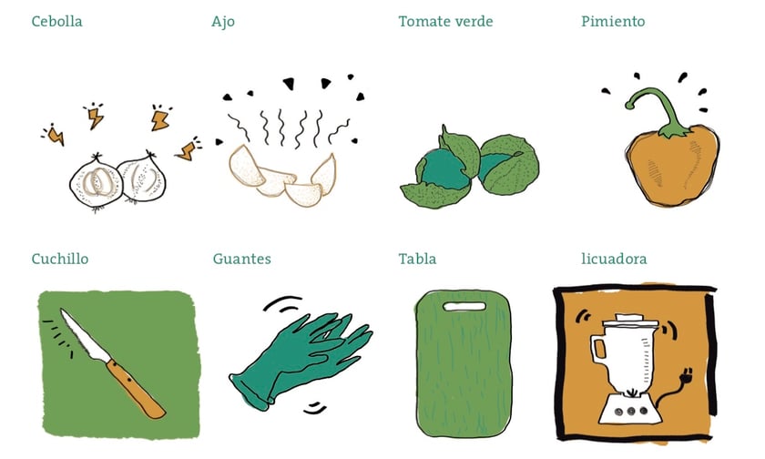 Se retira el tallo del chile manzano y se pica en cuadros pequeños. De igual modo se pican todos los ingredientes. Se coloca todo en el vaso de una licuadora con 500 mL de agua y se licua. Posteriormente se cuela la preparación y se vierte la mezcla en tres litros de agua.